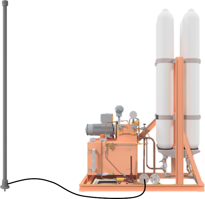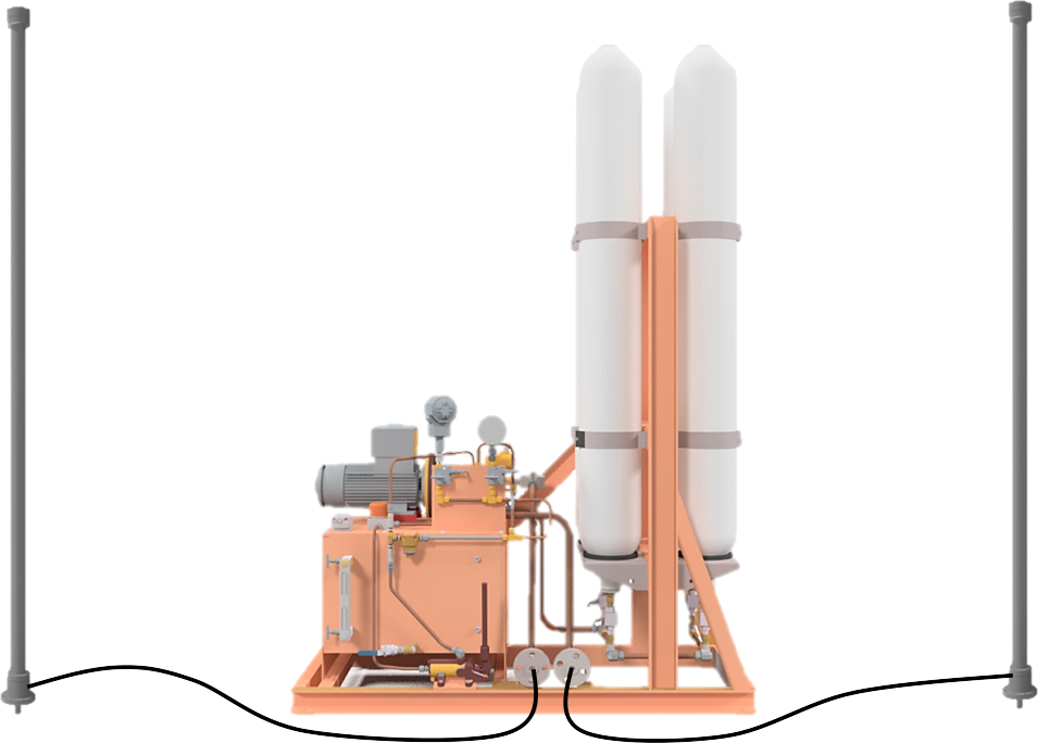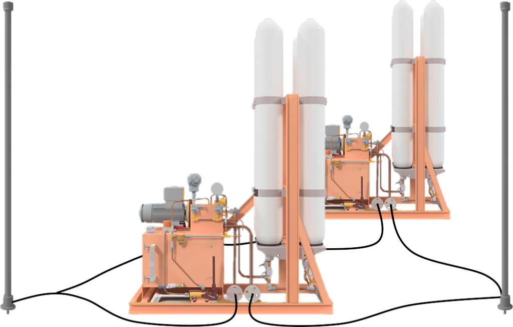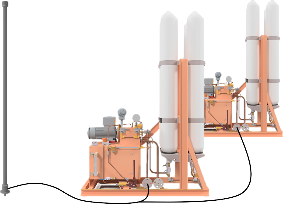 Two linked units drive a single well using an accumulator-based counterweight system. This configuration is ideal for particularly demanding wells requiring greater power.